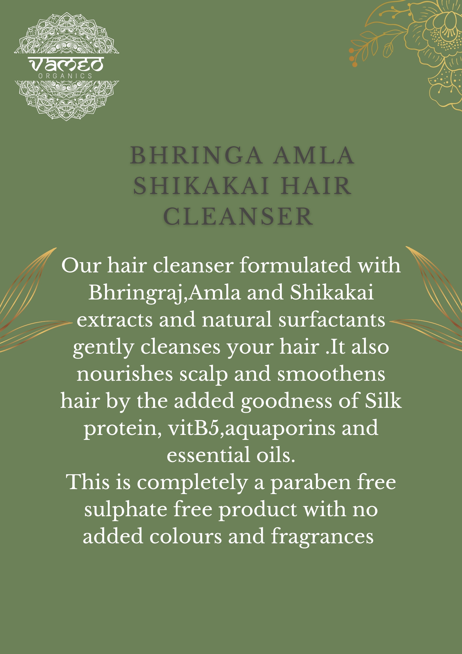 Bhringa Amla Shikakai Hair Cleanser crafted with Bhringraj, Shikakai and Amla extracts and gentle surfactants, sulfate-free and paraben-free. Enriched with silk protein, Hydagen aquaporin, Vit B5, and the essence of Tea Tree, Rosemary, Basil, and Lavender essential oils, this formulation offers a wholesome cleansing experience. It not only cleanses but also nourishes your hair, leaving it refreshed and revitalized. Plus, it's fragrance-free for a pure and natural feel.