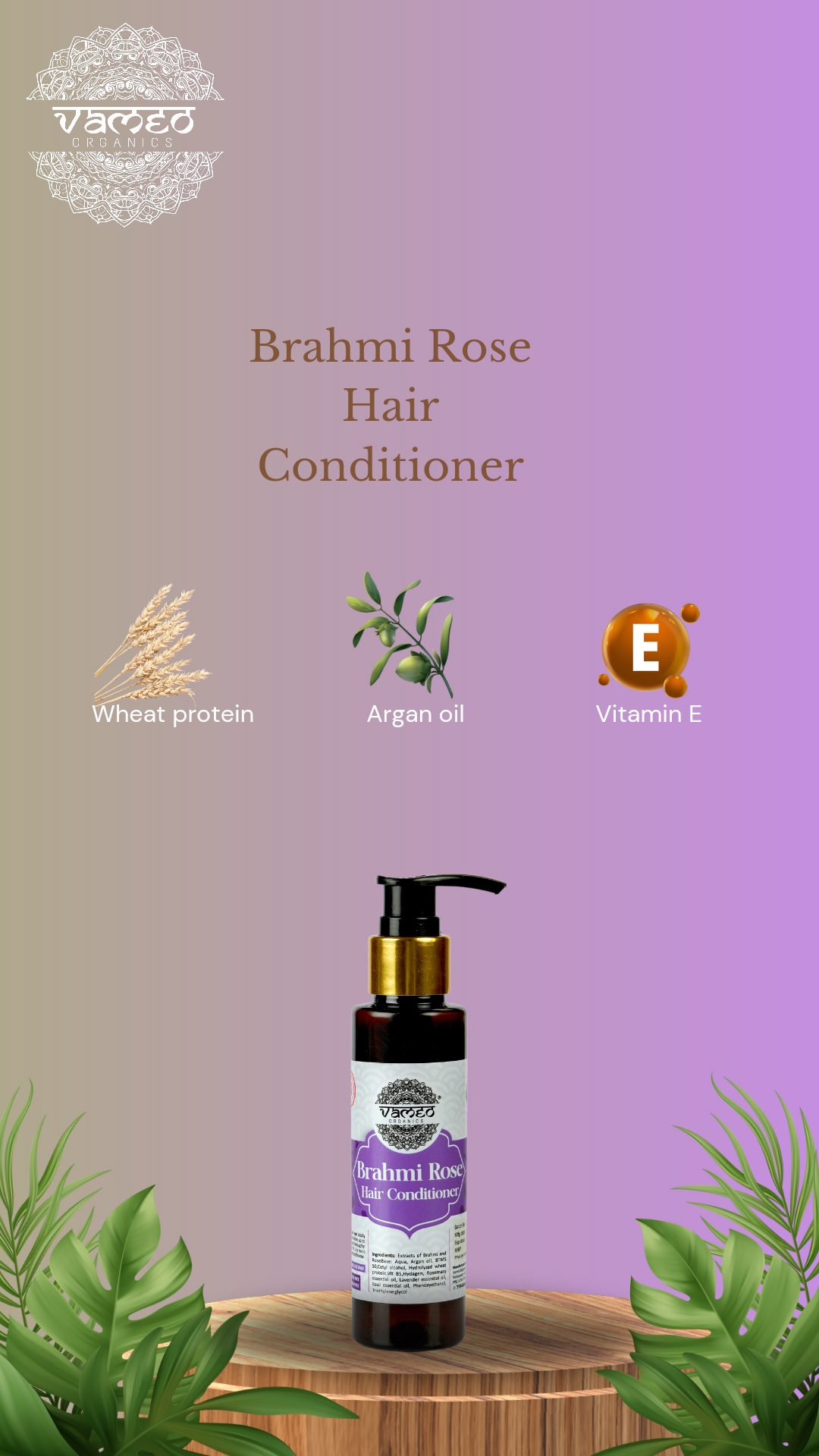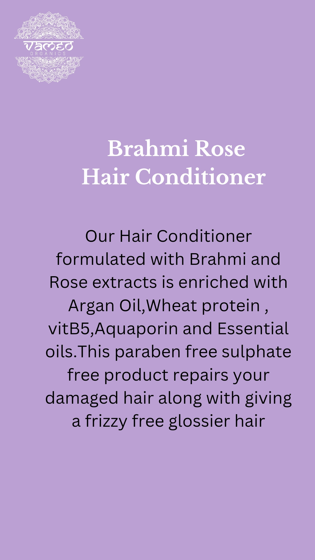 Brahmi Rose Hair Conditioner, formulated with the enriching properties of Brahmi extracts and Rose hydrosol. Infused with the goodness of Argan oil, Wheat protein, Vit B5, Hydagen aquaporin, Rosemary essential oil, and Lavender essential oil, this conditioner repairs your damaged hair.